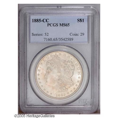 <B>1885-CC<S$1> MS65 PCGS.</B></I> Light tan color visits this lustrous and crisply struck Gem. Faint luster grazes and mint-made roller marks on the cheek determine the grade.