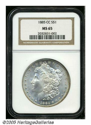 <B>1885-CC<S$1> MS65 PCGS.</B></I> Sharply struck and highly lustrous, with a mildly prooflike appearance in the fields and attractive light rim toning on both sides. Well preserved and free of any serious surface distractions.