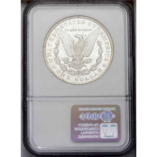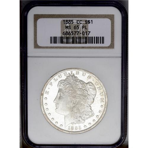 <B>1885-CC<img border='0' src='http://www.heritagecoins.com/images/star.gif' width=10 height=10>$1 MS65 Prooflike NGC.</B></I> A stunning Gem with fully prooflike fields around highly lustrous devices, resulting in splendid cameo contrast. Just a trace of pale gold color may be seen on each side of this lovely dollar.