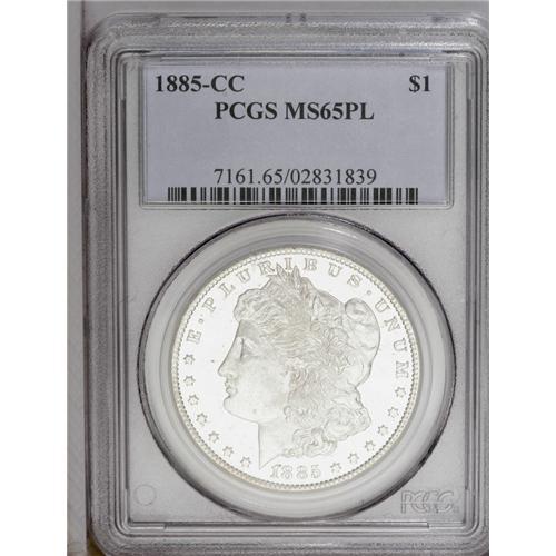 <B>1885-CC<img border='0' src='http://www.heritagecoins.com/images/star.gif' width=10 height=10>$1> MS65 Prooflike PCGS.</B></I> A flashy and crisply struck Gem that has clean fields and an occasional wisp of tan patina. The lowest mintage Carson City Morgan issue.