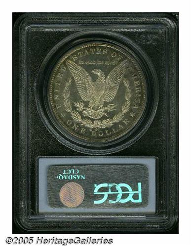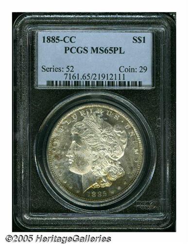 <B>1885-CC<S$1> MS65 Prooflike PCGS.</B></I> Bright golden-brown, ruby-red, powder-blue, and lime colors endow the borders of this lustrous and meticulously struck Gem. A tiny spot above the olive branch does not distract.