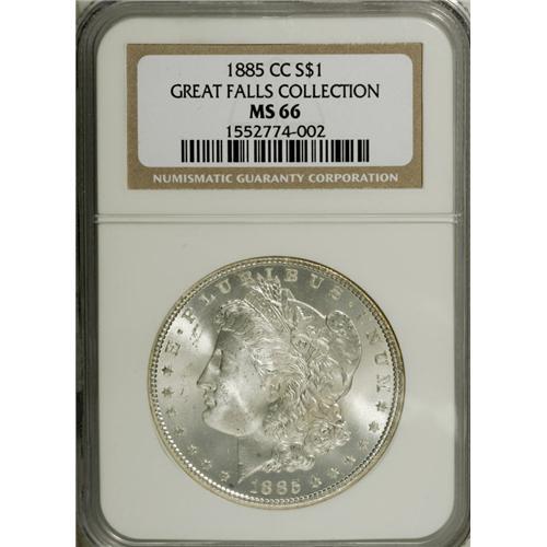 <B>1885-CC S$1 MS66 NGC.</B></I> A small 'dash' is located beneath the second 8 in the date. A lustrous, brilliant Carson City dollar with few surface marks and a very high degree of eye appeal.<BR><I>From The Great Falls Collection.</B></I><BR><BR><b>Shipping:</b> Coins & Currency (<a target="_blank" href="http://www.heritageauctions.com/common/shipping.php">view shipping information</a>)