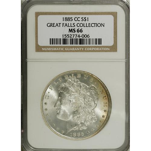 <B>1885-CC S$1 MS66 NGC.</B></I> Another bright, frosty, mostly untoned Premium Gem with a small band of peach-gold toning at the right obverse periphery. A single scuff mark is noted on Liberty's jawline.<BR><I>From The Great Falls Collection.</B></I><BR><BR><b>Shipping:</b> Coins & Currency (<a target="_blank" href="http://www.heritageauctions.com/common/shipping.php">view shipping information</a>)