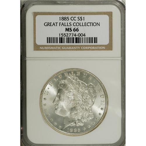 <B>1885-CC S$1 MS66 NGC.</B></I> Another brilliant, ice-white Premium Gem example of this popular Carson City date, with just a bit of golden toning near the reverse border. Typically struck for the issue, with teeming mint frost and few surface blemishes on either side.<BR><I>From The Great Falls Collection.</B></I><BR><BR><b>Shipping:</b> Coins & Currency (<a target="_blank" href="http://www.heritageauctions.com/common/shipping.php">view shipping information</a>)