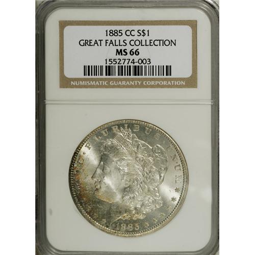 <B>1885-CC S$1 MS66 NGC.</B></I> Slightly weak over the centers, as usual, but highly attractive with bold luster and impressive surface preservation. An attractive blend of mottled gold, orange, sea-green and crimson patina adorns the lower left obverse, but just a trace of golden toning appears at the corresponding lower left reverse location.<BR><I>From The Great Falls Collection.</B></I><BR><BR><b>Shipping:</b> Coins & Currency (<a target="_blank" href="http://www.heritageauctions.com/common/shipping.php">view shipping information</a>)