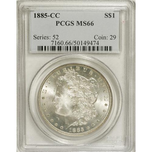 <B>1885-CC S$1 MS66 PCGS.</B></I> Intense mint frost illuminates both sides of this lustrous and unabraded Carson City silver dollar. Sharply struck except for two wheat leaves near the coronet tip.<BR><BR><b>Shipping:</b> Coins & Currency (<a target="_blank" href="http://www.heritageauctions.com/common/shipping.php">view shipping information</a>)