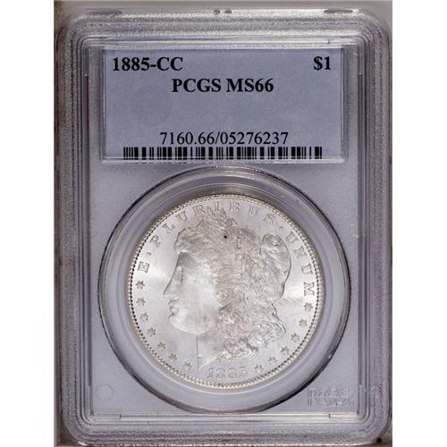 <B>1885-CC<img border='0' src='http://www.heritagecoins.com/images/star.gif' width=10 height=10>$1> MS66 PCGS.</B></I> The majority of 1885-CC dollars are in grades MS60 through MS65; the population figures point to a significant drop in certified coins between MS65 and MS66. The Premium Gem offered here displays excellent luster and just a few wisps of light tan color. Except for weakness in the curl over Liberty's ear, the design elements are well impressed. A few minute contact marks located on the cheek and neck are mentioned for accuracy. PCGS has seen only 36 pieces finer (3/06). <BR><BR><B>Important notice:</B> Heritage usually auctions material at the rate of 200-250 lots per hour. On some occasions eBay Live bid software or the Internet may not be able to keep up with the pace of the auction. We recommend placing a realistic absentee bid now as insurance to avoid disappointment. Occasionally the auctioneer may eliminate or reject an eBay Live bid, and the auctioneer may also reopen a lot after the close of the eBay live bidding (usually because we missed an audience bid), and may reject your bid even if it shows you as the winning bidder. By bidding via eBay Live, you agree that Heritage may award the lot to another bidder at its sole discretion under the circumstances described above or any other reasonable circumstances. Since eBay bids are not shown to us until we open the lot on the floor, we treat those bids just like floor bids. In most cases the floor responds before the eBay bid is presented to us, due to Internet lag time, so for consistency we have made it a policy that floor bids are always considered first over tie eBay live bids. Also please note that all Heritage lots purchased through eBay Live carry a 20% Buyer's Premium. Please make sure you read the Terms and Conditions before you bid. This lot is being auctioned in conjunction with a live floor auction by Heritage Galleries & Auctioneers. All final auction and invoice information will be supplied by Heritage Galleries & Auctioneers, and all other information should be considered preliminary. Lot:3436 <BR><BR><B>Winning Notification and Billing:</B> After the FINAL session in this auction is complete, Heritage will send e-mail and snail mail invoices. This process normally takes several days. All final auction and invoice information will be supplied by Heritage Galleries & Auctioneers, and all other information should be considered preliminary. <BR><BR>This auction will be conducted on a live auction floor and over the Internet through eBay Live. If you choose to place an absentee bid, please take a moment to <font color='#0000ff'><u><a href='http://pages.ebay.com/liveauctions/help/before/laabsentee.html'>learn how eBay Live absentee bidding works</a></u></font><font color='#000000'>
