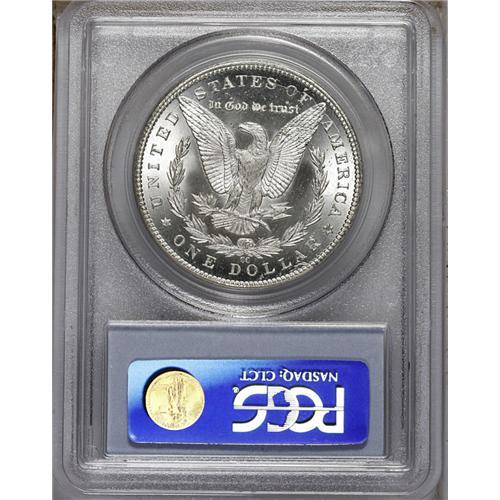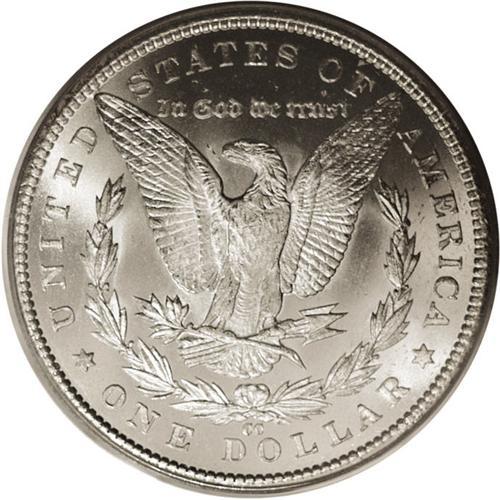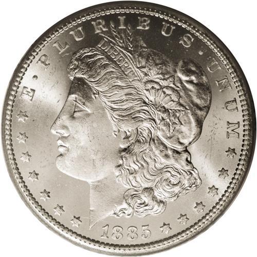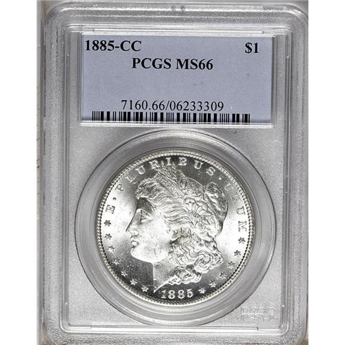 <B>1885-CC<img border='0' src='http://www.heritagecoins.com/images/star.gif' width=10 height=10>$1> MS66 PCGS.</B></I> The majority of the Mint State 1885-CC dollar population is in grades MS63 through MS65, with a precipitous drop between Gem and Premium Gem. The MS66 coin presented here displays frosty silver surfaces that are untoned, and the design features are well brought up, except for minor softness in the hair above Liberty's ear. Some minute marks on Liberty's face and in the obverse fields are unworthy of individual mention.
