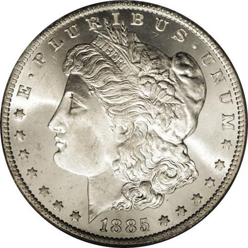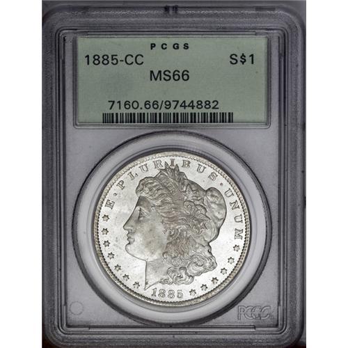 <B>1885-CC<img border='0' src='http://www.heritagecoins.com/images/star.gif' width=10 height=10>$1> MS66 PCGS.</B></I> Translucent golden toning graces this well struck and flashy piece. The fields are uncommonly clean. The lowest mintage CC-mint dollar, the 1885-CC did emerge in quantity from the GSA hoard, but comparatively few examples can compare with the quality of the present Premium Gem. Certified in a green label holder.