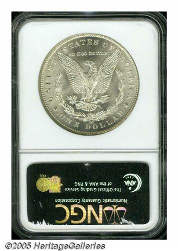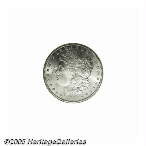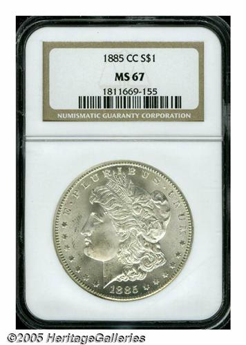 <B>1885-CC<S$1> MS67 NGC.</B></I> This lovely '85-CC Morgan displays relatively smooth, virtually untoned, lustrous surfaces that exhibit just a few minor luster grazes on Liberty's cheek and in the left (facing) obverse field. The design elements are sharply struck, with only the hair over Liberty's ear displaying minor softness. Superb Gems such as this are challenging to locate, and do not appear much finer - indeed, NGC and PCGS combined have certified only six coins grading higher (6/05).