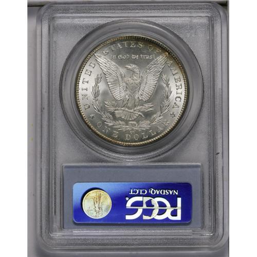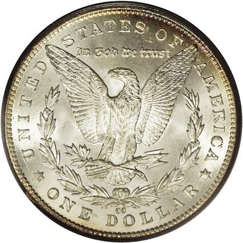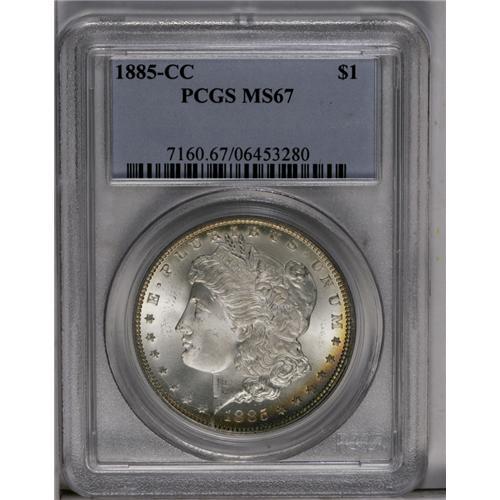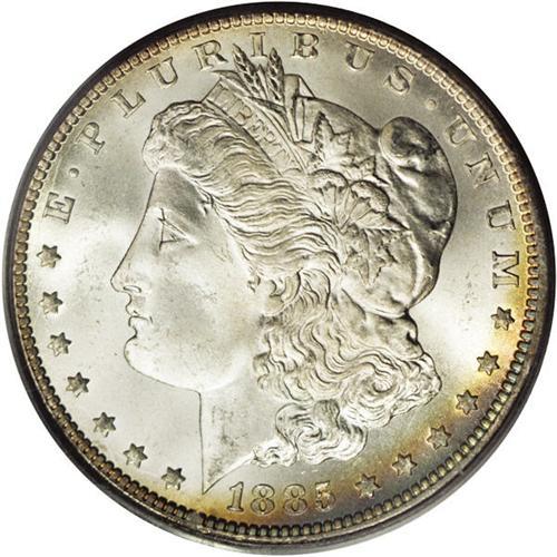 <B>1885-CC<img border='0' src='http://www.heritagecoins.com/images/star.gif' width=10 height=10>$1> MS67 PCGS.</B></I> This is one of the finest examples of this date that we have handled. In fact, PCGS has only certified a single finer quality coin. The surfaces have frosty luster, and are fully brilliant with the exception of a thin crescent of gold and steel-blue color along part of the obverse border. The reverse has an even thinner crescent. Population: 35 in 67, 1 finer (5/06).