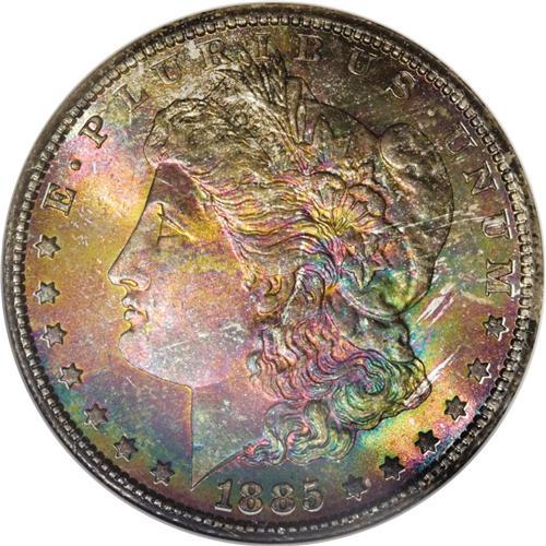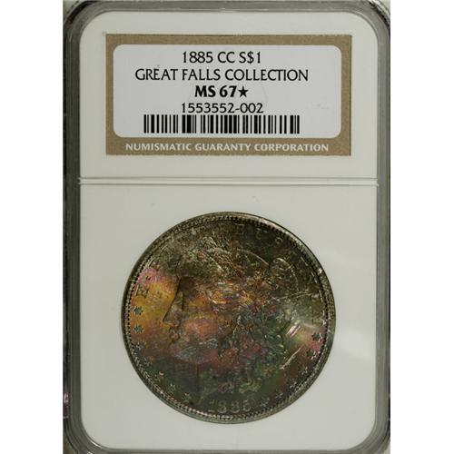 <B>1885-CC S$1 MS67 <img border='0' src='http://www.heritagecoins.com/images/star.gif' width=10 height=10> NGC.</B></I> Ex: Great Falls Collection. There is little doubt that the brief history of the Carson City Mint has gained the attention and desire of a large number of collectors and numismatists. The Mint only operated from 1870 to 1893, with these operations shutdown during 1886, 1887, and 1888. Thus the entire history of this Mint spanned just 21 years of operation. By comparison with most other branch mints, the number of coins struck in Carson City was small. Just 56 million coins were minted in Nevada during the entire history of the Mint. Only Charlotte and Dahlonega produced smaller total quantities (less than 2 million coins each over a period of 24 years at those facilities).<BR> This piece is clearly assigned the special <img border='0' src='http://www.heritagecoins.com/images/star.gif' width=10 height=10> designation by NGC for its special obverse color. Few of the surviving examples of this issue have any appreciable amount of toning as most were stored in Mint bags at the Treasury for nearly a century. Only those pieces that were in contact with the physical cloth of the bags became toned, and then only on one side, quite often the obverse. Not only is this example such a coin with rainbow toning on the obverse, but it is also a Superb specimen with pristine surfaces. The obverse exhibits remarkable intermingled gold, russet, lilac, and green color while the reverse is fully brilliant. It is a sharply struck piece with virtually full details on both sides.The combination of all these qualities is rarely equaled. In fact, NGC has only graded two coins in MS67 <img border='0' src='http://www.heritagecoins.com/images/star.gif' width=10 height=10> and none finer with a <img border='0' src='http://www.heritagecoins.com/images/star.gif' width=10 height=10> designation. Five coins have been certified as MS68, all without the <img border='0' src='http://www.heritagecoins.com/images/star.gif' width=10 height=10> modifier. In all grades, this single grading service has certified more than 10,000 examples of this issue (1/07)!<BR><I>From The Great Falls Collection.</B></I><BR><BR><b>Shipping:</b> Coins & Currency (<a target="_blank" href="http://www.heritageauctions.com/common/shipping.php">view shipping information</a>)
