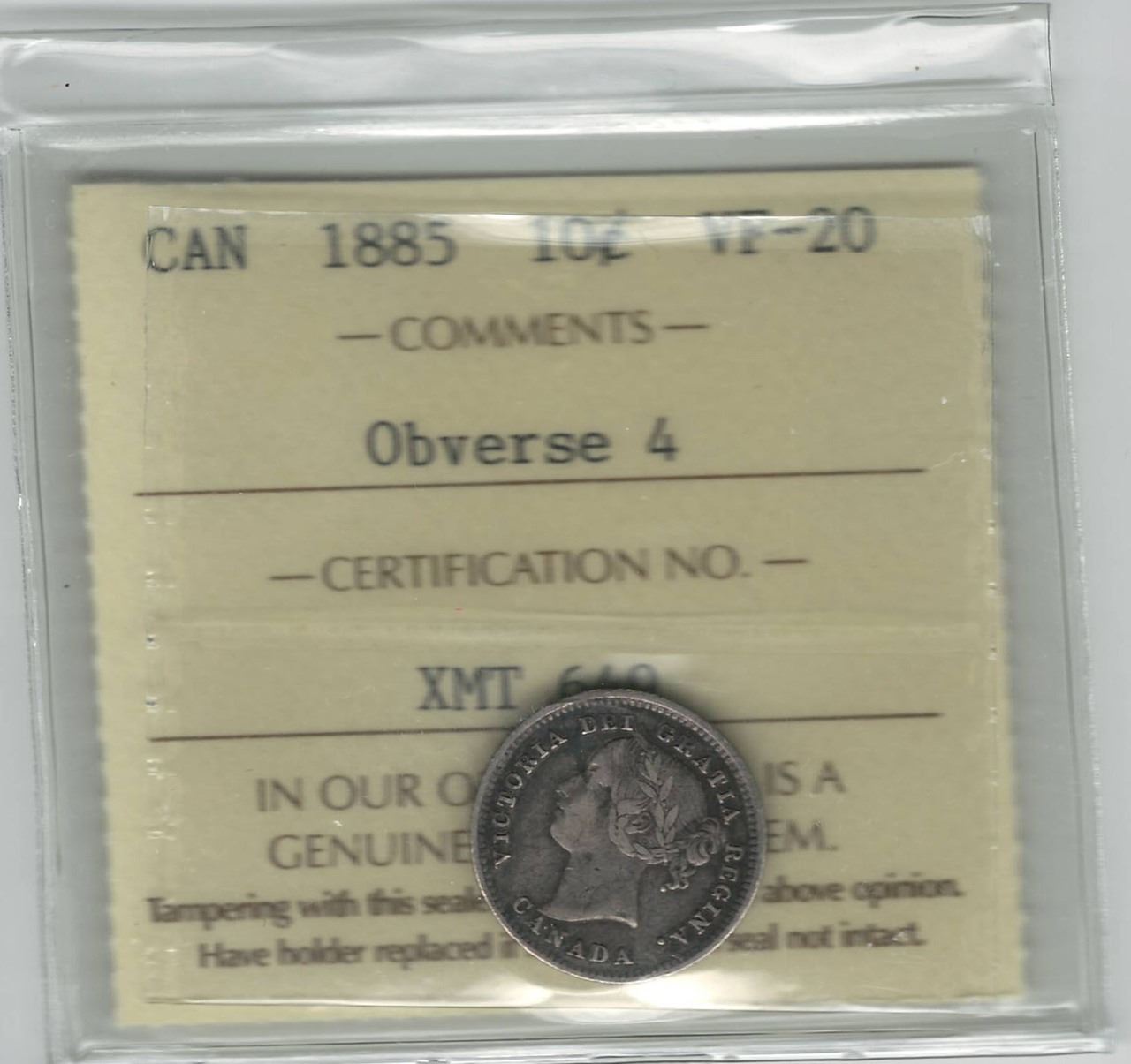 1885 Canada 10 Cent Obverse 4 ICCS VF 20