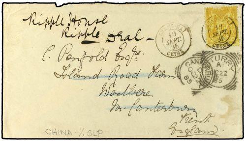 1885 Cover to England with reverse showing ´Shanghai Local Post´ cds in blue (Sept 10) of despatch, transferred to French Po and franked by Type Sage 25 c. yellow tied at Shanghai French PO on same day. On arrival in UK, cover struck twice with rare ´Stury´ and Canterbury squared circle datestamps. A rare cover.