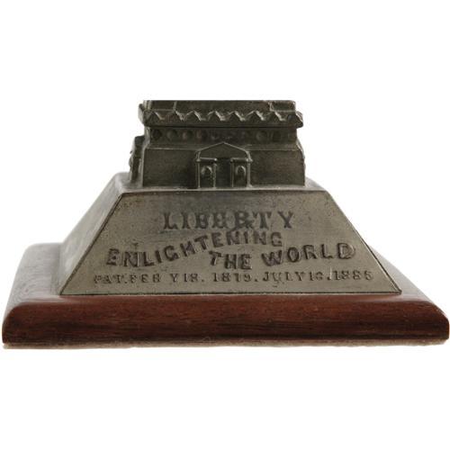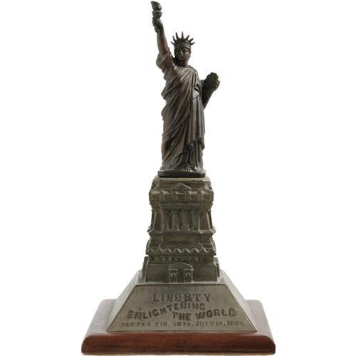 <B>1885 Dated Statue of Liberty Souvenir.</B></I> This nicely made two-part metal souvenir celebrates the coming dedication of the statue. On the base is the legend "Liberty Enlightening the World" in large lettering. Below is "Pat. Feb. 18, 1879. July 16, 1879". Made and marketed to encourage individuals to donate money to finish this project the piece stands a mear 7" tall but is a complete replica of the one that now stands in New York harbor. Fine "period" item.<BR><BR><b>Shipping:</b> Miscellaneous Collectibles, Smal (<a target="_blank" href="http://www.heritageauctions.com/common/shipping.php">view shipping information</a>)