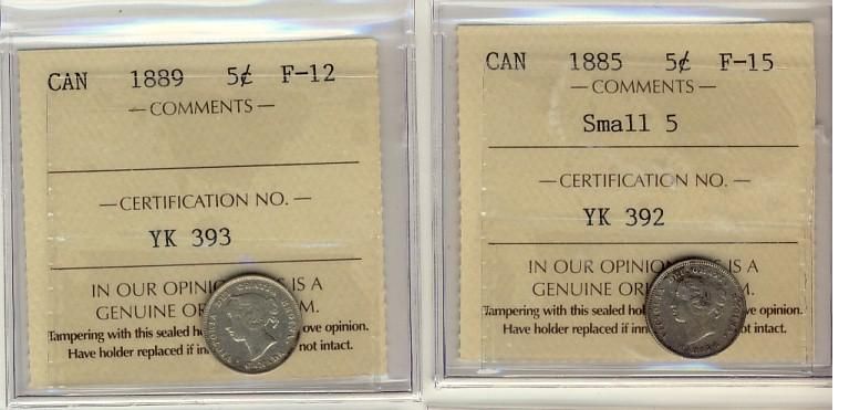 1885 F15 & 1889 F12 5¢. Lot of 2 ICCS graded coins.