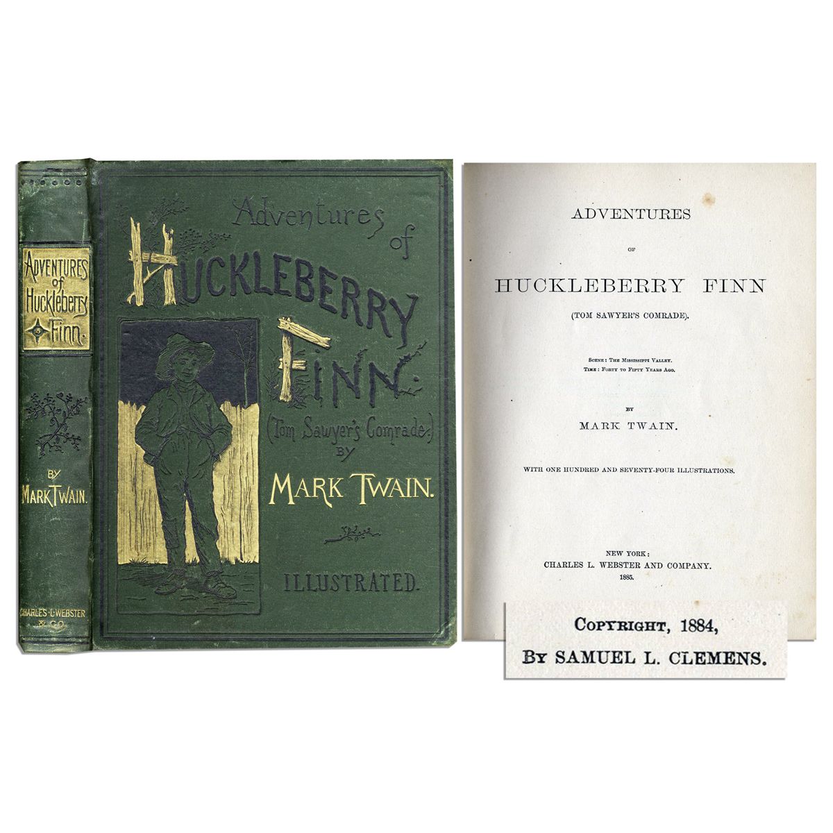 First edition, first printing of ''Adventures of Huckleberry Finn'' by Mark Twain, with illustrations by E.W. Kimble. New York: Charles L. Webster and Co.: 1885. Of this beloved classic that became the wellspring of American literary fiction, Hemingway said of it, ''All modern American literature comes from just one book by Mark Twain called 'Huckleberry Finn.''' All first edition, first print points present including: (1) The title page is a cancel (2) Copyright is listed as 1884 on the title page verso. (3) the Chapter 6 heading reads ''decided'' rather than ''decides'' on page 9; (4) ''Him and another man'' is listed incorrectly on the table of contents; (5) page 57, 11 lines from bottom, reads: ''with the was'' instead of ''with the saw''; (6) ''Heliotype Printing Co.'' imprint is present on frontis as is tablecloth underneath the bust of Twain; (7) on page 155, the second ''5'' of the pagination is in a different font; (8) The ''l'' is missing in ''Col.'' and the letter ''B'' is broken on line 7 on page 143; (9) Page 283 is a cancel; (10) Final leaf is a blank; (11) The tablecloth under a bust of Mark Twain is plainly visible in the frontispiece photograph. Measures 7'' x 8.25''. Occasional foxing and toning within. Slightly cocked with wear to cloth at front hinge, else near fine condition.