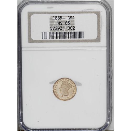 <B>1885 G$1 MS63 NGC.</B></I> A lustrous and appealing example from the waning years of this series. A nicely struck piece with peach-gold surfaces, one of just 11,100 struck.<BR><I>From The Jones Beach Collection.</B></I><BR><BR><b>Shipping:</b> Coin/Currency (<a target="_blank" href="http://www.heritageauctions.com/common/shipping.php">view shipping information</a>)