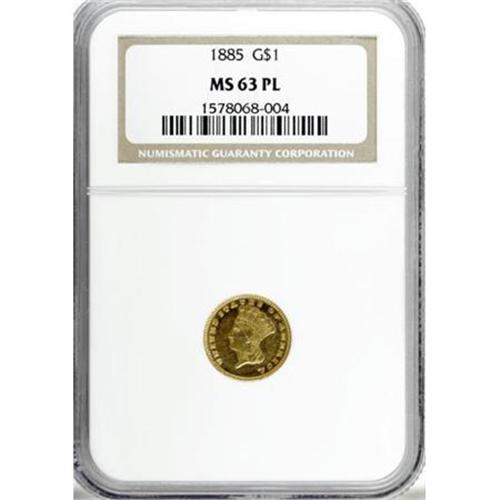 <B>1885 G$1 MS63 Prooflike NGC.</B></I> The yellow-gold fields are deeply reflective, though the well-defined devices offer little contrast. Wispy abrasions in the fields account for the grade. One of just 11,156 business strikes for the year. NGC has graded 10 finer Prooflike pieces (9/07).<BR><BR><B>Coin Engraver:</B> James B. Longacre<BR><BR><b>Shipping:</b> Coins & Currency (<a target="_blank" href="http://www.heritageauctions.com/common/shipping.php">view shipping information</a>)