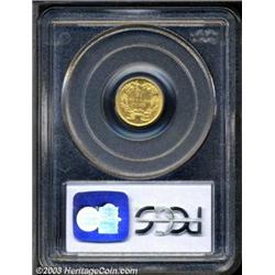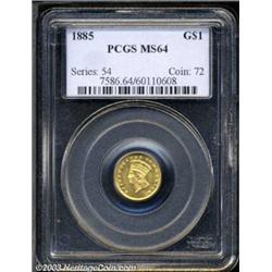 <TABLE cellSpacing=0 cellPadding=0 width="100%" bgColor=#000000 border=0><TBODY><TR><TD width="100%"><TABLE cellSpacing=1 cellPadding=3 width="100%" border=0><TBODY><TR><TD width="100%" bgColor=#79735c><FONT face=arial color=#ffffff size=3><B>Description</B> </FONT></TD></TR><TR><TD width="100%" bgColor=#ffffff><FONT face=arial size=2><B>1885 G$1 MS64 PCGS.</B></I> A pleasing semi-prooflike near-Gem with well struck devices. The reverse legends are also sharp, and only the C in AMERICA has a typical strike. Although the mintage of 11,156 pieces is relatively high for a late-date Gold Dollar, this issue remains scarce in Mint State. </FONT></TD></TR></TBODY></TABLE></TD></TR></TBODY></TABLE><BR><A name=PricesRealized></A><TABLE cellSpacing=0 cellPadding=0 width="100%" bgColor=#000000 border=0><TBODY><TR><TD width="100%"><TABLE cellSpacing=1 cellPadding=3 width="100%" border=0><TBODY><TR><TD width="100%" bgColor=#79735c><A name=PR><FONT face=arial color=#ffffff size=3><B>Previous Prices from Heritage Auctions</B> </FONT></A></TD></TR><TR><TD bgColor=#f6f6ed><TABLE cellSpacing=0 cellPadding=0 width="100%" border=1><TBODY><TR><TD align=middle width="33%"><B>Date</B></TD><TD align=middle width="33%"><B>Service</B></TD><TD align=middle width="33%"><B>Price</B></TD></TR><TR bgColor=whitesmoke><TD width="33%"><B>11/23/2002</B></TD><TD width="33%">PCGS</TD><TD width="33%">$900.45</TD></TR><TR bgColor=whitesmoke><TD width="33%"><B>04/05/2001</B></TD><TD width="33%">PCGS</TD><TD width="33%">$2,415.00</TD></TR><TR bgColor=whitesmoke><TD width="33%"><B>04/30/1993</B></TD><TD width="33%">PCGS</TD><TD width="33%">$1,870.00</TD></TR><TR bgColor=whitesmoke><TD width="33%"><B>01/01/1996</B></TD><TD width="33%">PCGS</TD><TD width="33%">$1,155.00</TD></TR><TR bgColor=whitesmoke><TD width="33%"><B>01/01/1991</B></TD><TD width="33%">PCGS</TD><TD width="33%">$7,040.00</TD></TR><TR bgColor=whitesmoke><TD width="33%"><B>05/01/1992</B></TD><TD width="33%">PCGS</TD><TD width="33%">$1,320.00</TD></TR><TR bgColor=whitesmoke><TD width="33%"><B>04/02/1993</B></TD><TD width="33%">NGC</TD><TD width="33%">$1,430.00</TD></TR><TR bgColor=whitesmoke><TD width="33%"><B>06/01/1991</B></TD><TD width="33%">NGC</TD><TD width="33%">$1,210.00</TD></TR></TBODY></TABLE></TD></TR><TR><TD bgColor=#ffffff><FONT face=arial size=1 ?>PLEASE NOTE: All prices realized reflect the final hammer price PLUS the buyer's premium in auctions that charge a buyer's premium. Each item has a notation at the top of the listing indicating whether that lot included a buyer's premium. Example: A item that sells with a final hammer price of $100 and a 20% buyer's premium will display with a price realized of $120. All information listed is intended to be as accurate as possible, but errors are possible. Please use this guide carefully and inform us of any inaccuracies. </FONT></TD></TR></TBODY></TABLE></TD></TR></TBODY></TABLE><BR><TABLE cellSpacing=0 cellPadding=0 width="100%" bgColor=#000000 border=0><TBODY><TR><TD width="100%"><TABLE cellSpacing=1 cellPadding=3 width="100%" border=0><TBODY><TR><TD width="100%" bgColor=#79735c colSpan=6><FONT face=arial color=#ffffff size=3><B>Price Guide*</B> </FONT></TD></TR><TR bgColor=#f6f6ed><TD align=middle><B>Grade</B> </TD><TD align=middle><B>Coin World<BR>(Trends)</B> </TD><TD align=middle><B>Numismedia<BR>Retail</B> </TD><TD align=middle><B>Numismedia<BR>Wholesale</B> </TD><TD align=middle><B>Coin<BR>Universe</B> </TD><TD align=middle><B>Heritage<BR>Value Index</B> </TD></TR><TR bgColor=#ffffff><TD align=middle>63</TD><TD align=right>$900.00</TD><TD align=right>---</TD><TD align=right>$865.00</TD><TD align=right>$675.00</TD><TD align=right>$653.85</TD></TR><TR style="FONT-WEIGHT: bold" bgColor=#cccfdd><TD align=middle>64</TD><TD align=right>$1,025.00</TD><TD align=right>---</TD><TD align=right>$1,075.00</TD><TD align=right>$900.00</TD><TD align=right>$773.13</TD></TR><TR bgColor=#ffffff><TD align=middle>65</TD><TD align=right>$2,100.00</TD><TD align=right>---</TD><TD align=right>$1,550.00</TD><TD align=right>$1,750.00</TD><TD align=right>$1,588.75</TD></TR><TR bgColor=#ffffff><TD colSpan=6><FONT size=1>*All information listed is intended to be as accurate as possible, but errors are possible. No item may be returned or refused based on this information which is provided as a service to our customers. You should contact each pricing source directly to determine the accuracy of this information. </FONT></TD></TR></TBODY></TABLE></TD></TR></TBODY></TABLE><BR><TABLE cellSpacing=0 cellPadding=0 width="100%" bgColor=#000000 border=0><TBODY><TR><TD width="100%"><TABLE cellSpacing=1 cellPadding=3 width="100%" border=0><TBODY><TR><TD width="100%" bgColor=#79735c><FONT face=arial color=#ffffff size=3><B>Population Guide</B> </FONT></TD></TR><TR bgColor=#ffffff><TD align=middle><!-- Begin Output of Population Grid--><TABLE cellSpacing=0 cellPadding=0 width="100%" border=0><TBODY><TR><TD vAlign=center><TABLE cellSpacing=0 width="100%" border=1 cellsadding="3"><TBODY><TR><TD vAlign=center><TABLE cellSpacing=0 cellPadding=3 width="100%" border=1><TBODY><TR><TD vAlign=center align=middle bgColor=#f0f1e8 colSpan=2 <CENTER><FONT face=Arial size=2><B>PCGS Pop </B></FONT><CENTER></CENTER></TD><TD vAlign=center align=middle bgColor=#f0f1e8 colSpan=2><CENTER><FONT face=Arial size=2><B>NGC Pop</B></CENTER></FONT></TD></TR><TR><TD vAlign=center><FONT face=Arial size=2>(64)</FONT> </TD><TD vAlign=center align=right><FONT face=Arial size=2>62</FONT> </TD><TD vAlign=center><FONT face=Arial size=2>(64)</FONT> </TD><TD vAlign=center align=right><FONT face=Arial size=2>60</FONT> </TD></TR><TR><TD vAlign=center><FONT face=Arial size=2>(>64)</FONT> </TD><TD vAlign=center align=right><FONT face=Arial size=2>90</FONT> </TD><TD vAlign=center><FONT face=Arial size=2>(>64)</FONT> </TD><TD vAlign=center align=right><FONT face=Arial size=2>105</FONT> </TD></TR></TBODY></TABLE></TD></TR></TBODY></TABLE></TD></TR></TBODY></TABLE><!-- End Output of Po