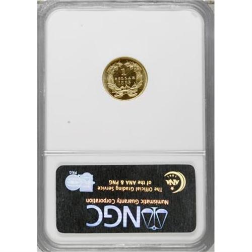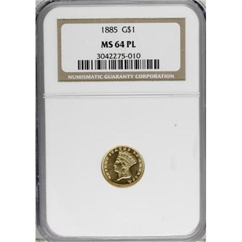 <B>1885 G$1 MS64 Prooflike NGC.</B></I> According to Garrett and Guth, this issue normally trades at only a small premium above type. They were probably not thinking of Prooflike examples, however, when making that observation. This example displays sensational reflectivity in the fields. The design elements are well struck and post-striking surface blemishes are nearly nonexistent, although some wispy roller marks (as struck) are noted on each side of the piece. Census: 5 in 64 Prooflike, 5 finer (6/07).<BR><BR><b>Shipping:</b> Coins & Currency (<a target="_blank" href="http://www.heritageauctions.com/common/shipping.php">view shipping information</a>)