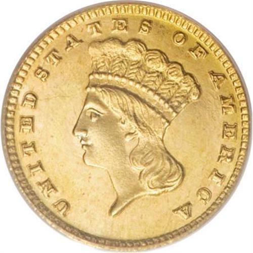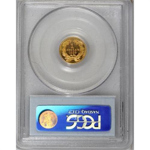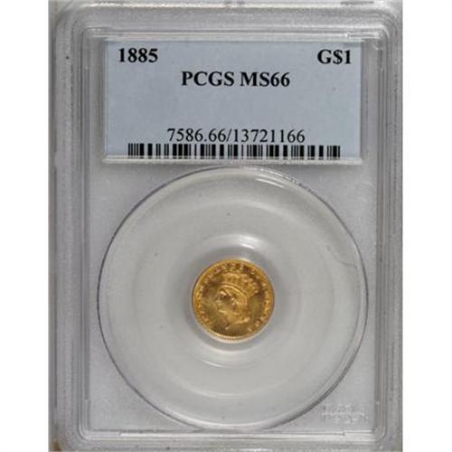 <B>1885 G$1 MS66 PCGS.</B></I> Boldly struck, with rather dramatic machine doubling noted on the obverse and reverse lettering, and on the outer edges of the lower wreath leaves. This flashy Premium Gem also displays heavy die polish lines in the obverse fields, and minor die wear on Liberty's hair. None of these as struck features detract in the slightest from the overall appearance of this splendid gold dollar, however. Population: 26 in 66, 10 finer (8/07). <BR><BR><B>Coin Engraver:</B> James B. Longacre<BR><BR><b>Shipping:</b> Coins & Currency (<a target="_blank" href="http://www.heritageauctions.com/common/shipping.php">view shipping information</a>)