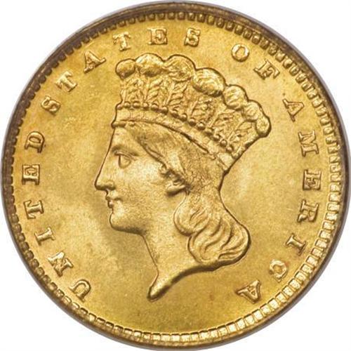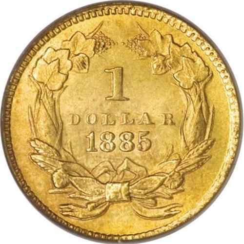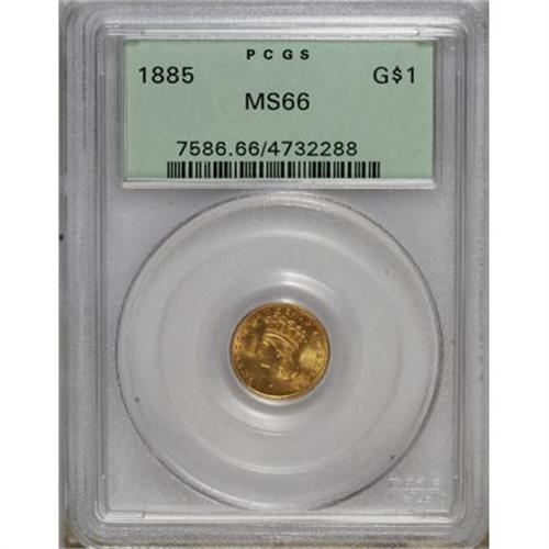 <B>1885 G$1 MS66 PCGS.</B></I> Splendid peach-gold toning drapes this lustrous and unabraded Premium Gem. Well struck despite slight softness on the right-side reverse dentils. Only 11,100 pieces were struck, and a number of those were presumably used as love tokens, a fad of the era. Certified in a green label holder. Population: 28 in 66, 10 finer (2/08).<BR><BR><B>Coin Engraver:</B> James B. Longacre<BR><BR><b>Shipping:</b> Coins & Currency (<a target="_blank" href="http://www.heritageauctions.com/common/shipping.php">view shipping information</a>)