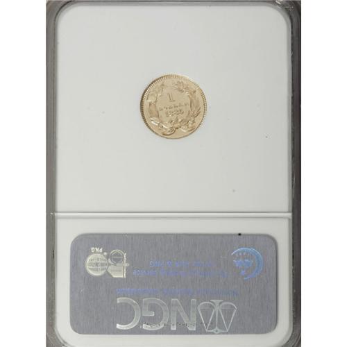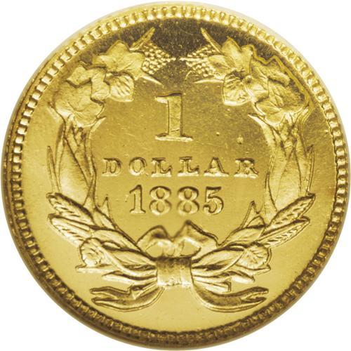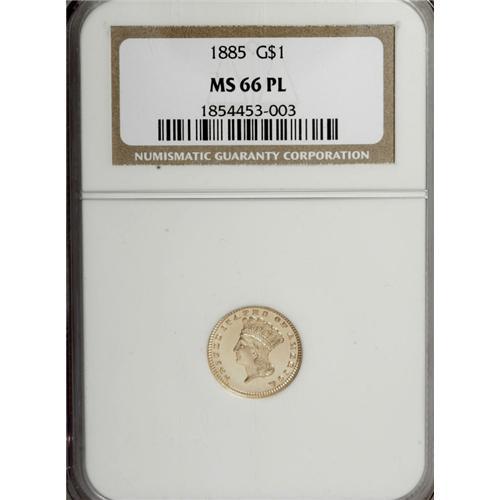 <B>1885 G$1 MS66 Prooflike NGC.</B></I> A superb and thoroughly delectable example of this issue, that, despite its relatively high mintage of more than 11,000 pieces, is surprisingly unavailable in grades above Gem. This specimen offers superlative black-on-gold contrast, as thick mint frost coats the devices on each side. Even under a loupe, there are no remotely mentionable contact marks. The strike is sharp, with no apparent weakness, and as a further bonus, none of the irregular rims sometimes seen on this issue are noted. An irresistible type coin! Census: 2 in 66 Prooflike, 0 finer (3/07).<BR><BR><b>Shipping:</b> Coins & Currency (<a target="_blank" href="http://www.heritageauctions.com/common/shipping.php">view shipping information</a>)