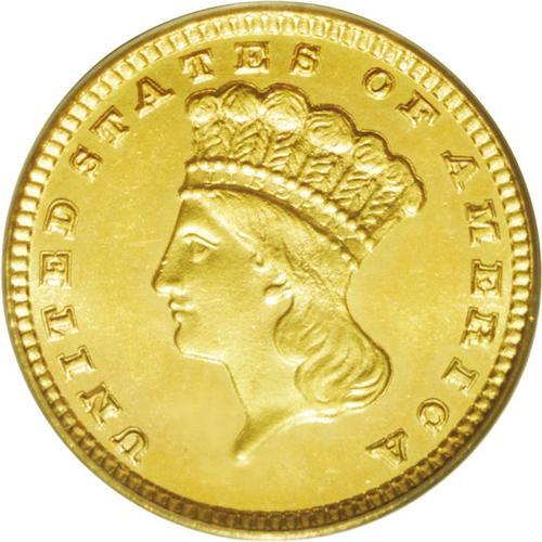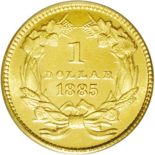 <B>1885<G$1> MS67 PCGS.</B></I> At first glance, this Superb Gem looks just like a proof. In fact, we are not completely convinced otherwise, although PCGS has stated that it is a business strike. Both sides have fully mirrored fields and lustrous devices with excellent cameo contrast. Every detail of the design on each side is fully defined, including the tiny lines of the feathers in the headdress. Every letter in LIBERTY is complete and sharp. The fields on both sides have the wavy or watery appearance usually associated with proof coins. Finally, the reverse has a small lintmark inside the left branch of the wreath. It is only the depth of the mirrored fields that may preclude a proof determination. Both sides are highly lustrous with rich yellow and orange-gold color. Regardless of the production method, this is an amazing example. Population: 9 in 67, 0 finer (6/06).