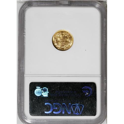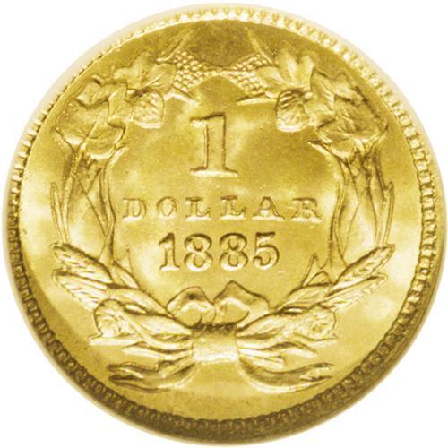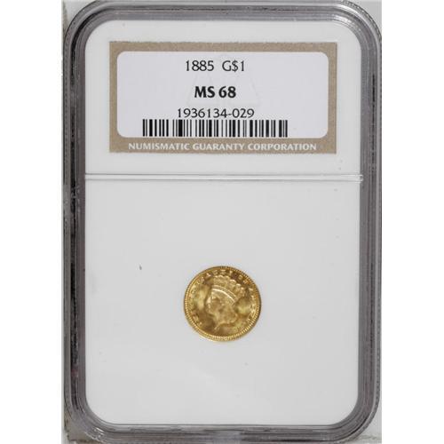 <B>1885<G$1> MS68 NGC.</B></I> The 1885 (11,156 business strikes produced) is among the more conditionally challenging gold dollars from the 1880s. Were examples not as widely preserved as those of some of the lower mintage deliveries from this decade? We may never know. What we do know is that the coin in this lot is one of the most appealing gold dollars of any date that we have handled in quite some time. The devices are fully brought up, and there are no distracting surface impairments. Khaki and orange-gold coloration adorns the intensely lustrous surfaces. A great coin, and one of just three examples to earn the MS68 grade designation. Census: 3 in 68, 0 finer (7/06).<BR><I>From The Derrick Snider Collection.</B></I>