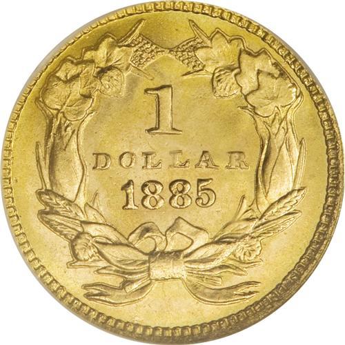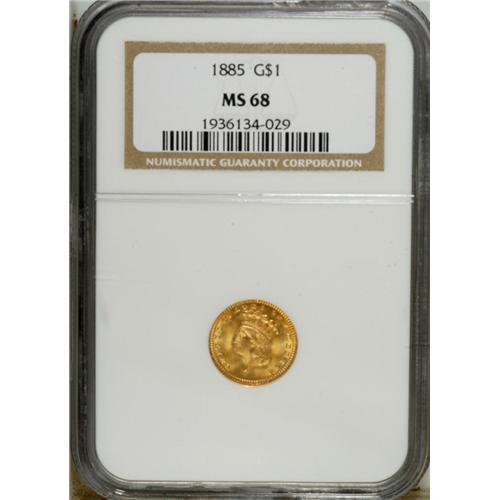 <B>1885 G$1 MS68 NGC.</B></I> The 1885 (11,156 business strikes produced) is among the more conditionally challenging gold dollars from the 1880s. Were examples not as widely preserved as those of some of the lower mintage deliveries from this decade? We may never know. What we do know is that the coin in this lot is one of the most appealing gold dollars of any date that we have handled in quite some time. The devices are fully brought up, and there are no distracting surface impairments. Khaki and orange-gold coloration adorns the intensely lustrous surfaces. A great coin, and one of just three examples to earn the MS68 grade designation. Census: 3 in 68, 0 finer (4/07).<BR><BR><b>Shipping:</b> Coins & Currency (<a target="_blank" href="http://www.heritageauctions.com/common/shipping.php">view shipping information</a>)