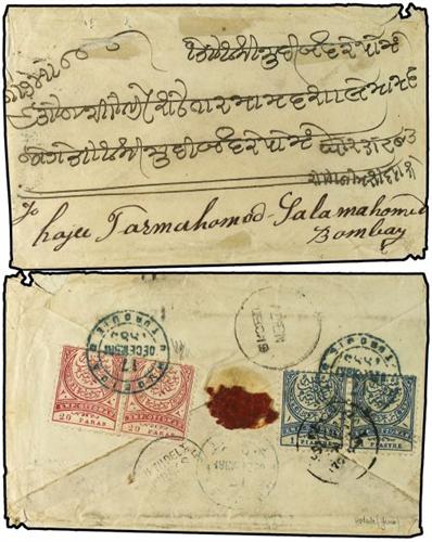1885 HODEIDA a BOMBAY. Circulada con sellos de Turquia de 20 par. rosa (2) y 1 pi. azul (2) (Sc. 98,99) mat. HODEIDA/TURQUIE, fechadores de transito de Aden y llegada a Bombay. MUY RARA. Cert. HOLCOMBE.