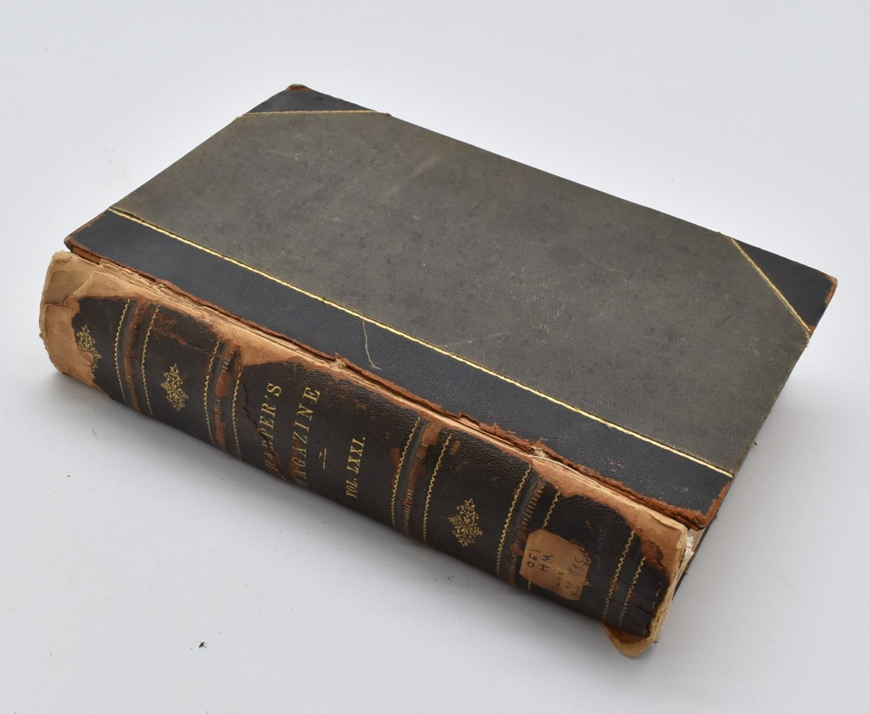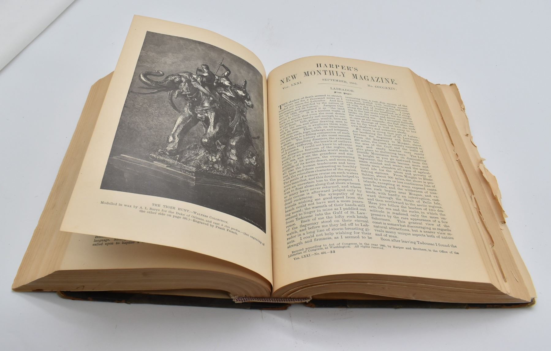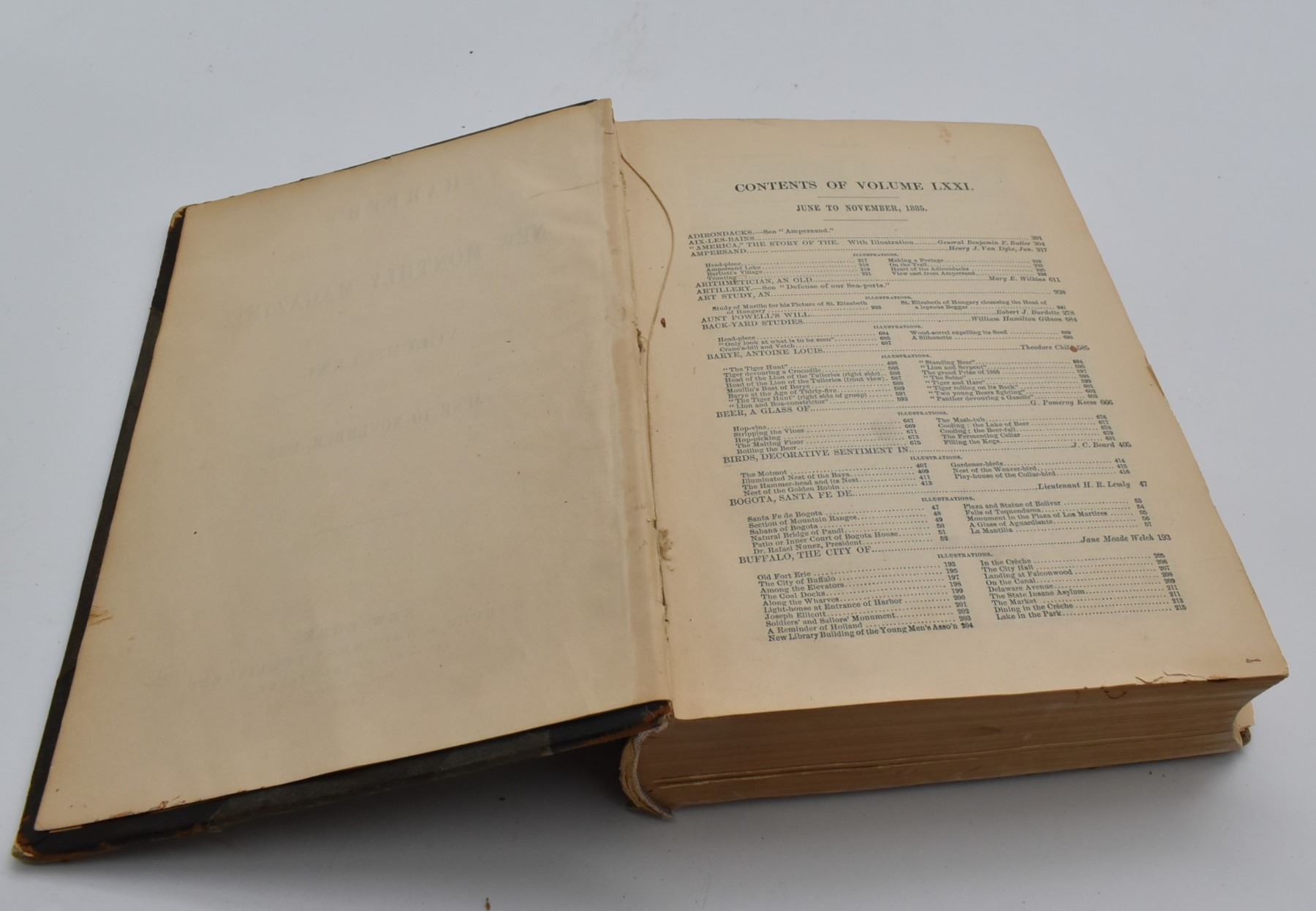 1885 Hardback Book Harper's New Monthly Magazine, hardback Volume LXXI, each month is prefaced with a full page engraving, plus the month is full of illustrations, the condition is fair, front and back boards are detached and the spine has seen some repair, the pages have tanning; however little, if any, foxing, a few pages at the end are detached and have some damage, the first two pages are detached