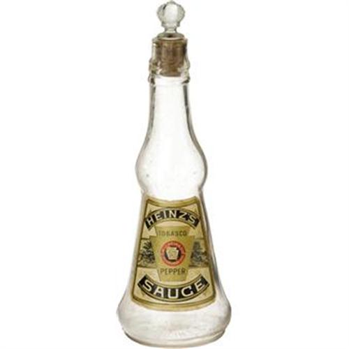 <B>1885 Heinz "Tobasco Pepper" Sauce Bottle with Original Stopper</B></I> and cork. Showing some sickness throughout, the bottle has no chips or flakes. The label is in excellent condition with only several small nicks on the upper edge and lower right corner. The lid and stopper still fits nice and tightly on the bottle itself. The bottle's curvy shape makes it a prime candidate for display. 8.75" Tall.
