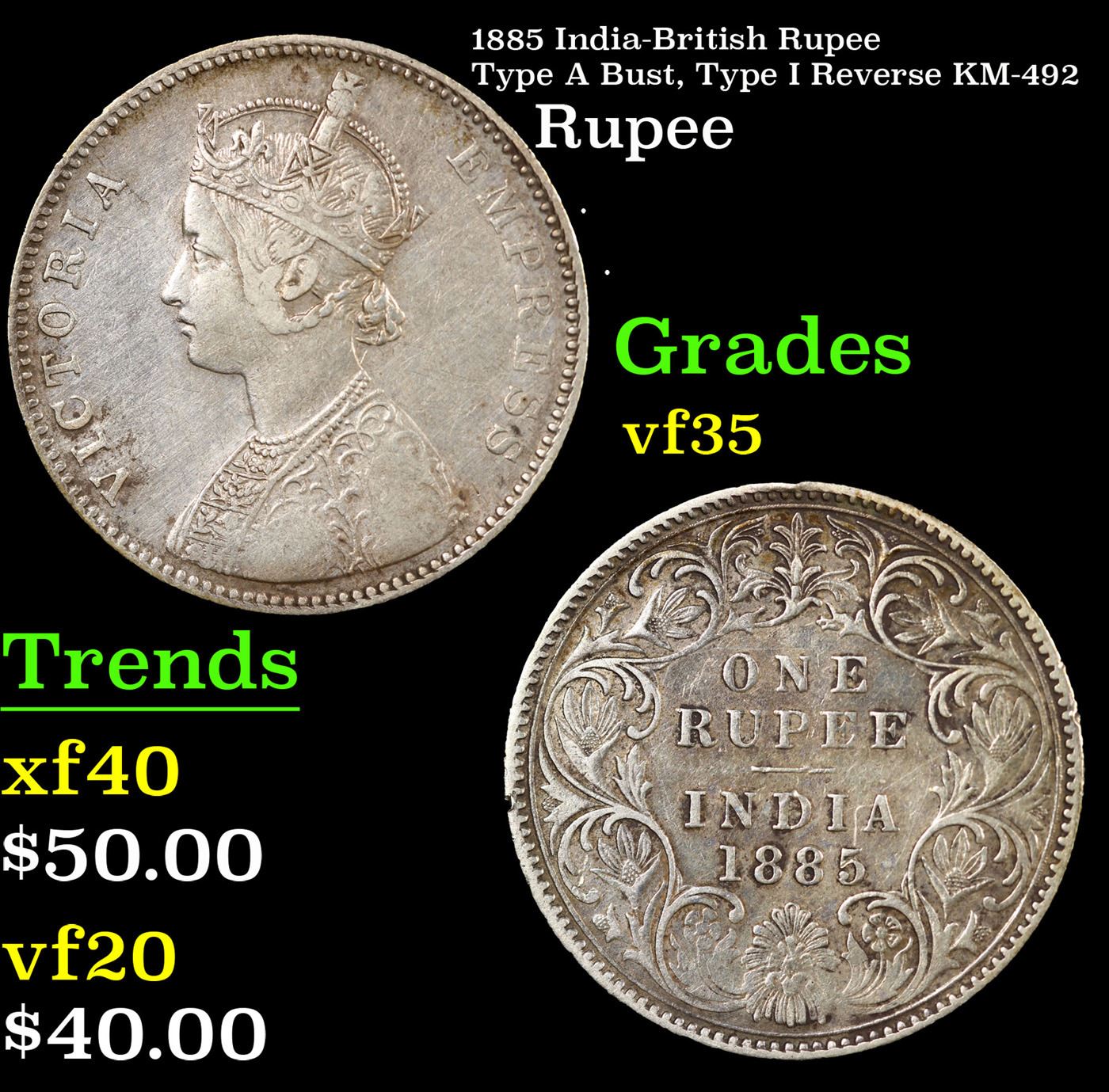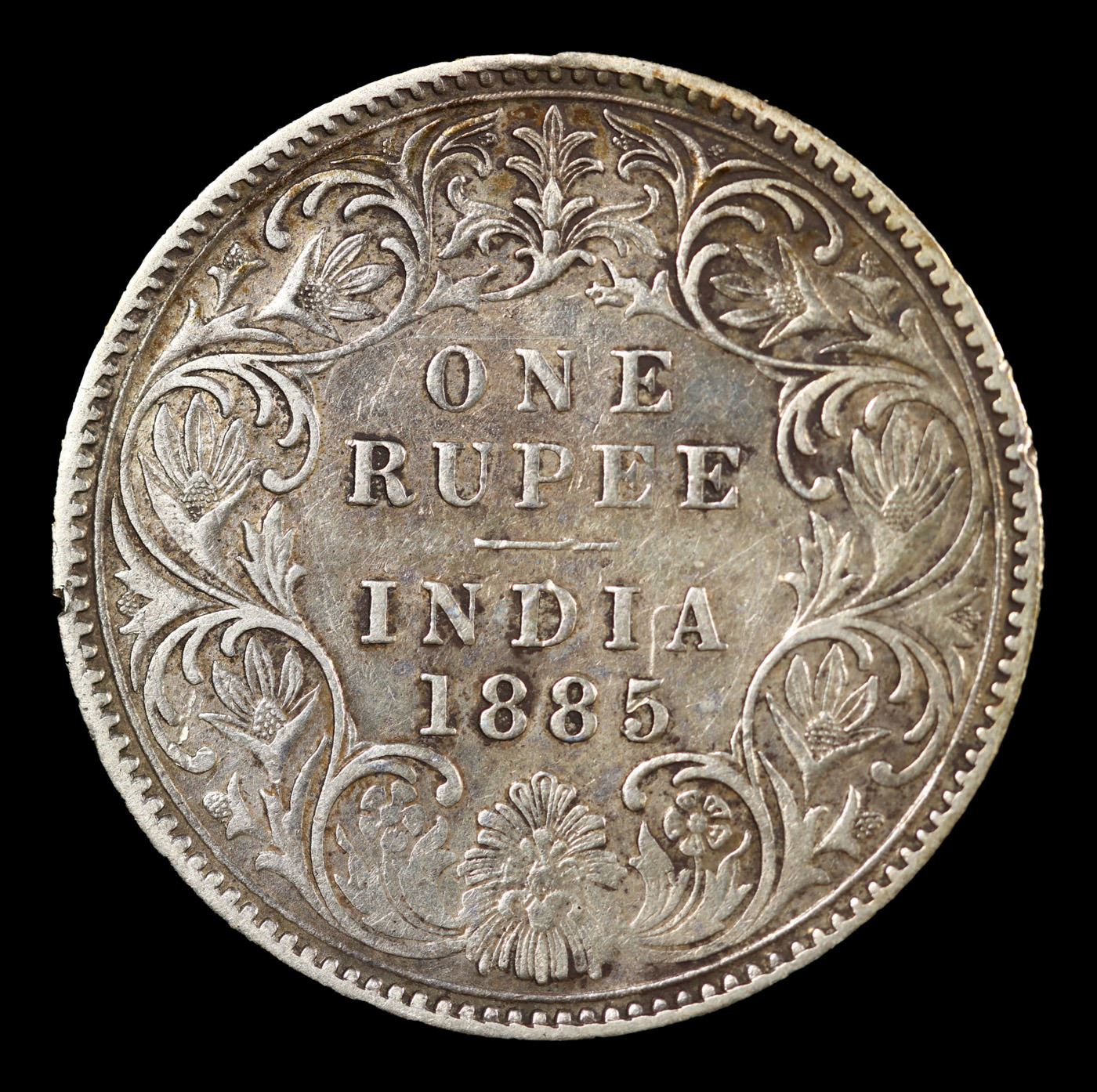 1885 India-British Rupee Type A Bust, Type I Reverse KM-492 Grades vf++. Obverse: Crowned bust leftObverse Legend: VICTORIA EMPRESSReverse: Value and date within wreath