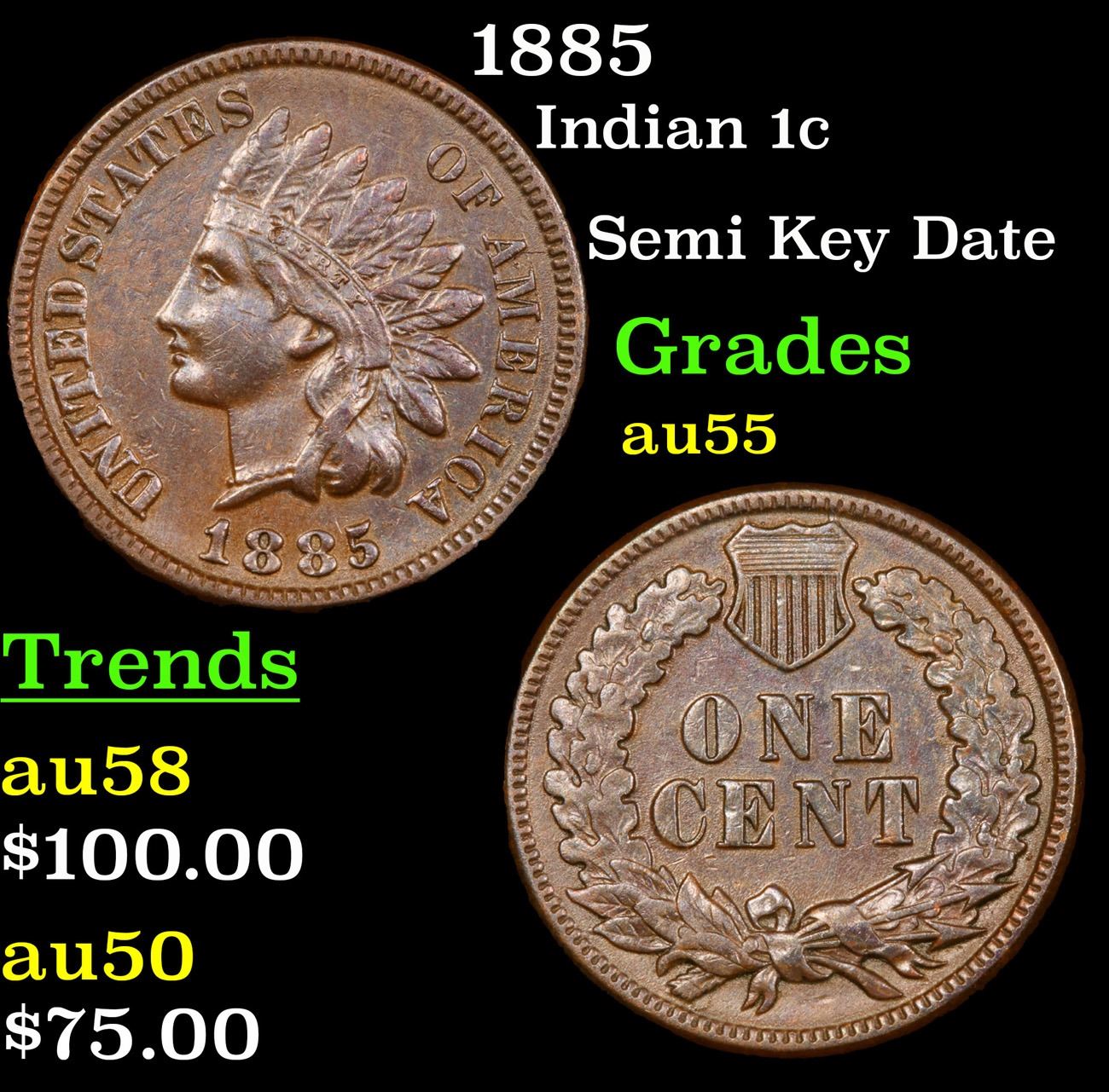 1885 Semi Key Date . Indian Cent 1c Grades Choice AU.