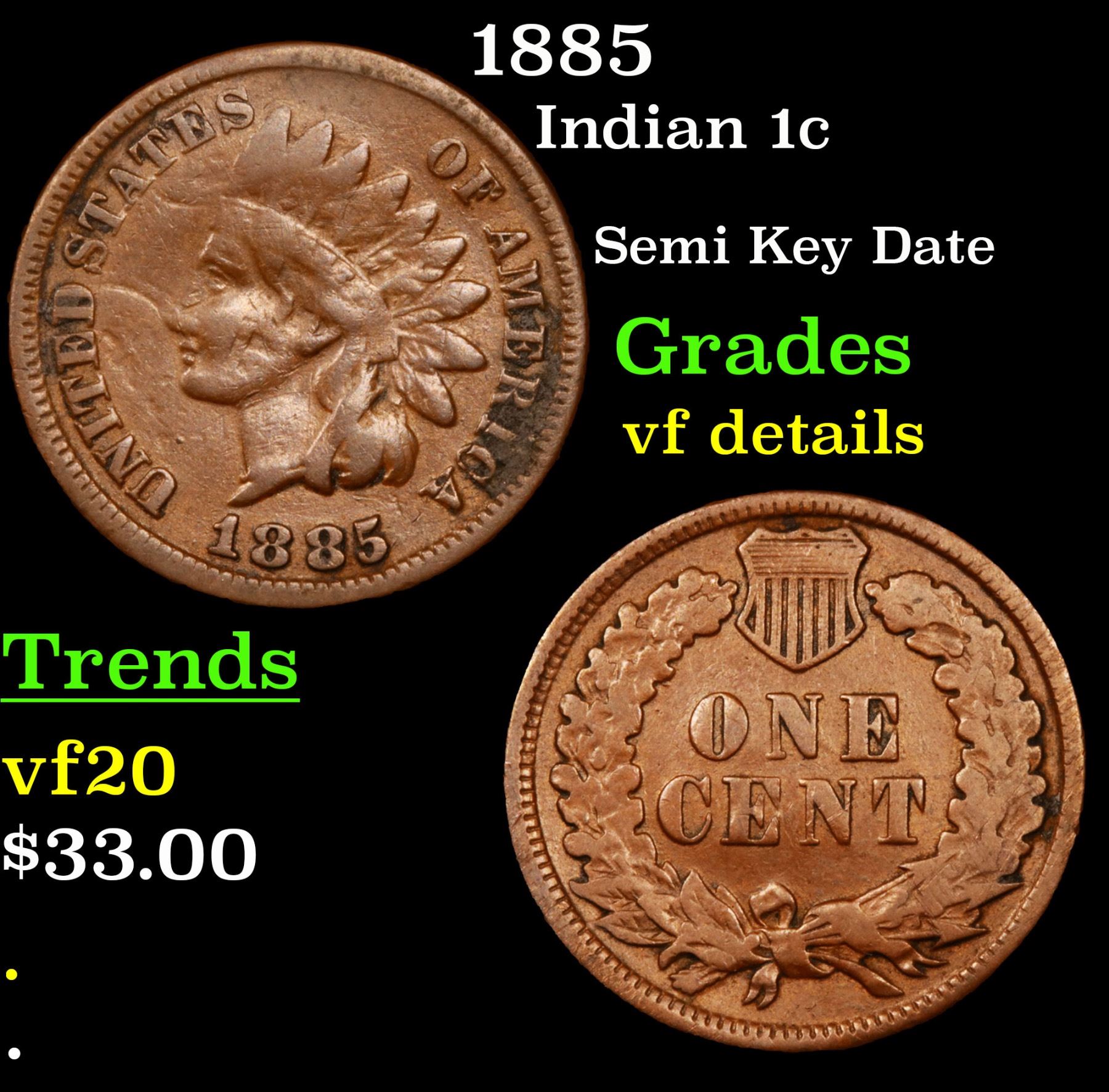 1885 Indian Cent 1c Grades vf details.
