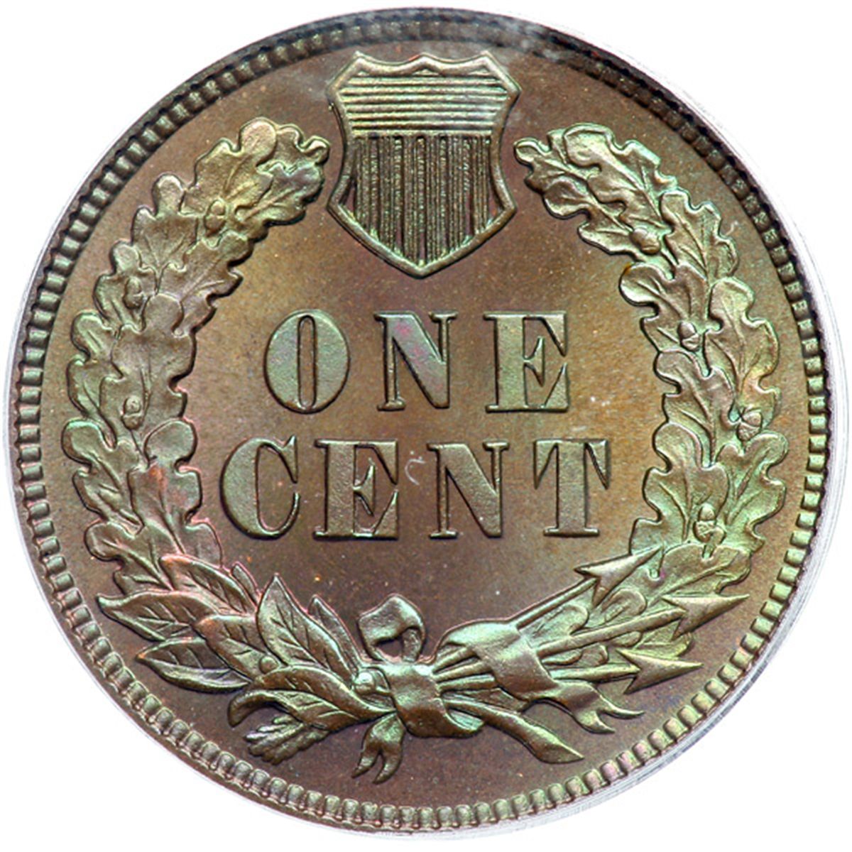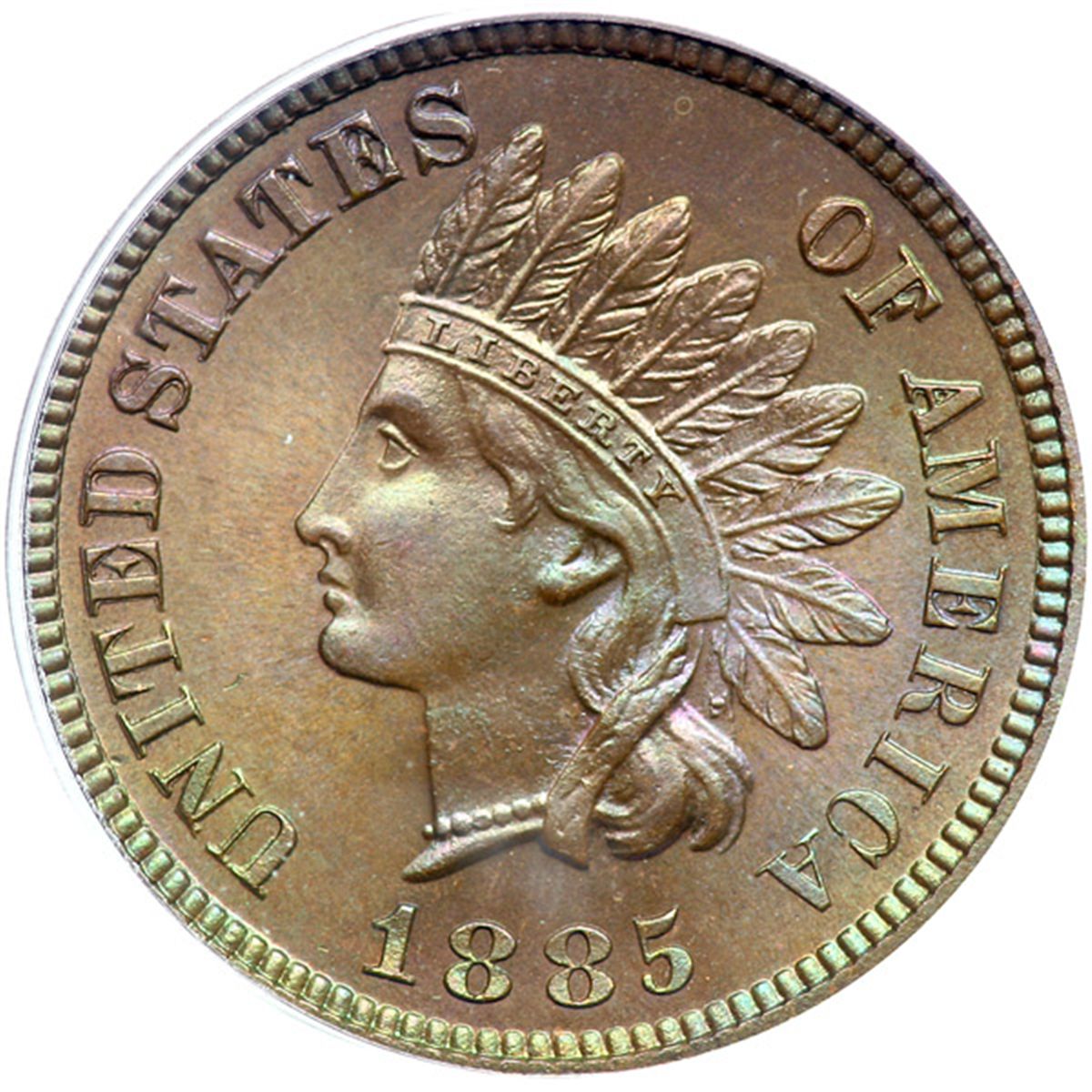 1885 Indian Head Cent. PCGS graded Proof 67+ Brown. A fantastic gem example with wonderful shades of vivid green and reddish-brown. Only 3790 proofs struck of which this beauty must be among the most attractive. Pop 1; The Finest Proof Brown example graded at PCGS (PCGS # 2342) .