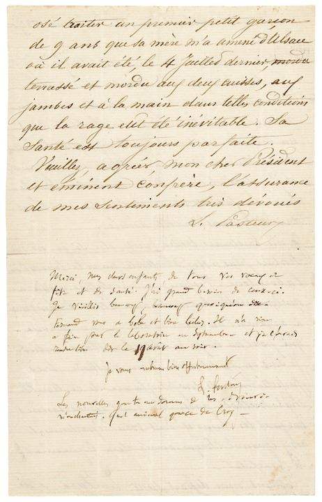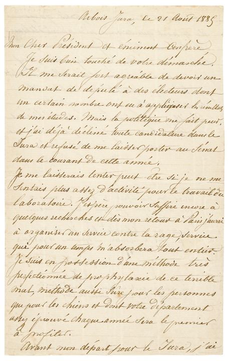 “My dear President and eminent Colleague: --- I am very touched by your proposition. I would find it very pleasant to owe the office of Representative to electors, some of whom have implemented from the results of my studies. However, I am afraid of politics and I have declined any candidacy in the Jura in the past and refused to run for the Senate this year. I would perhaps allow myself to be tempted if I did not have the energy to do laboratory work any longer. I still hope to be up to the task of doing some research and, as soon as I return to Paris, I will have to organize a service to combat rabies, which will fully absorb me for some time. I have in my possession a very advanced method of prophylaxis for this terrible malady, a method that is safe for both humans and dogs, and your region, which is sorely tested every year, will be the first to benefit from it. Before I left for the Jura, I dared to treat a first little 9 year old boy, whose mother brought him to me from Alsace where, on July 4, he had been bitten knocked down and bitten in both thighs, lower legs, and hand, under such conditions that rabies was inevitable. His health is still perfect. -- (Secretarial signature) “L. Pasteur”