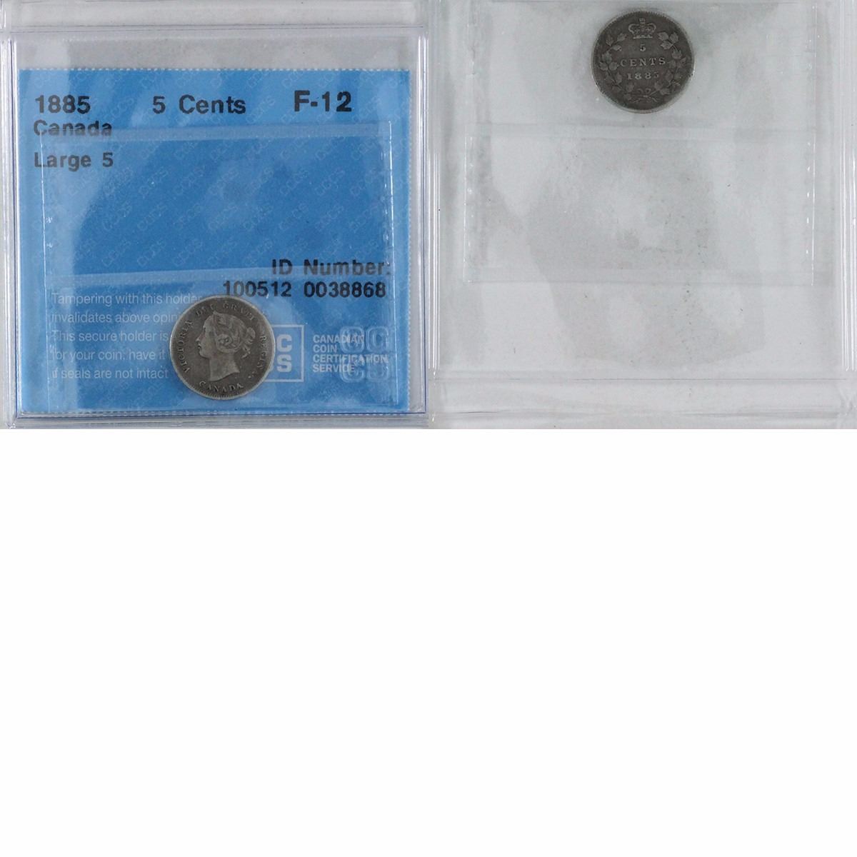 1885 Large 5 Canada 5-cent CCCS Certified F-12. Buyers Premium will be added on all items as per our terms of sale. We accept Paypal, Credit Card, E-Transfer Payments, Cheque or Money Orders (there is an additional 3% fee for using Paypal or Credit Card). All invoices will be emailed immediately following the auction, please contact us if you would like to pay by credit card or receive a new revised lower total for mailing in payment or sending an e-transfer (3% discount). All Items Are Sold "AS IS", no returns