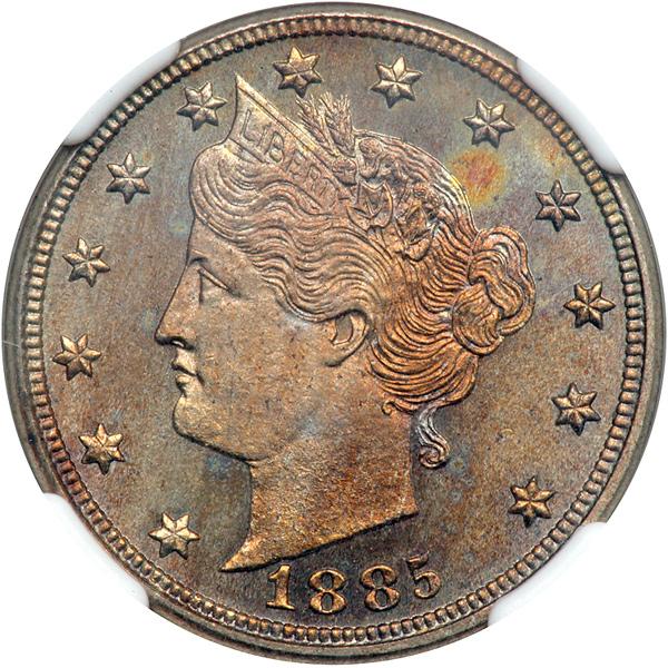 1885 Liberty Nickel. NGC graded Proof 63 PQ. Lovely golden toning; key date in this series.