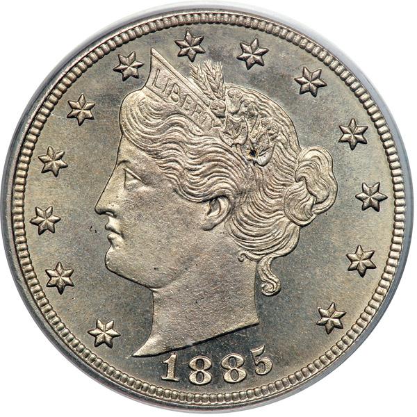 1885. PCGS graded PQ Proof 64 CAC Approved. Nice light even toning. Only 3,790 struck of this scarce-date Liberty "V" nickel (PCGS # 3883) .