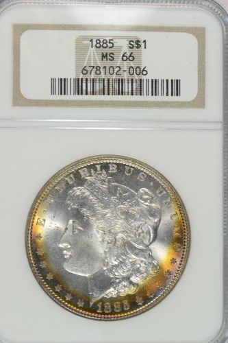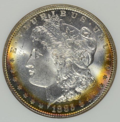 1885 MORGAN SILVER DOLLAR, NGC MS-66 STUNNING OBVERSE COLORS