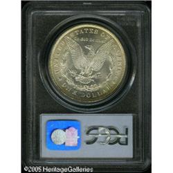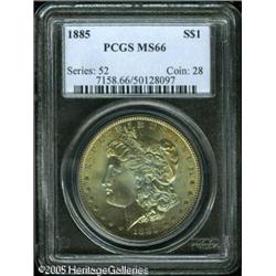 <B>1885<img border='0' src='http://www.heritagecoins.com/images/star.gif' width=10 height=10>$1 MS66 PCGS.</B></I> Iridescent aqua and gold color rests over the obverse, while the reverse remains brilliant. The design elements are sharply struck. Liberty's eyebrow and cheek reveal a few small marks. Lot:10181