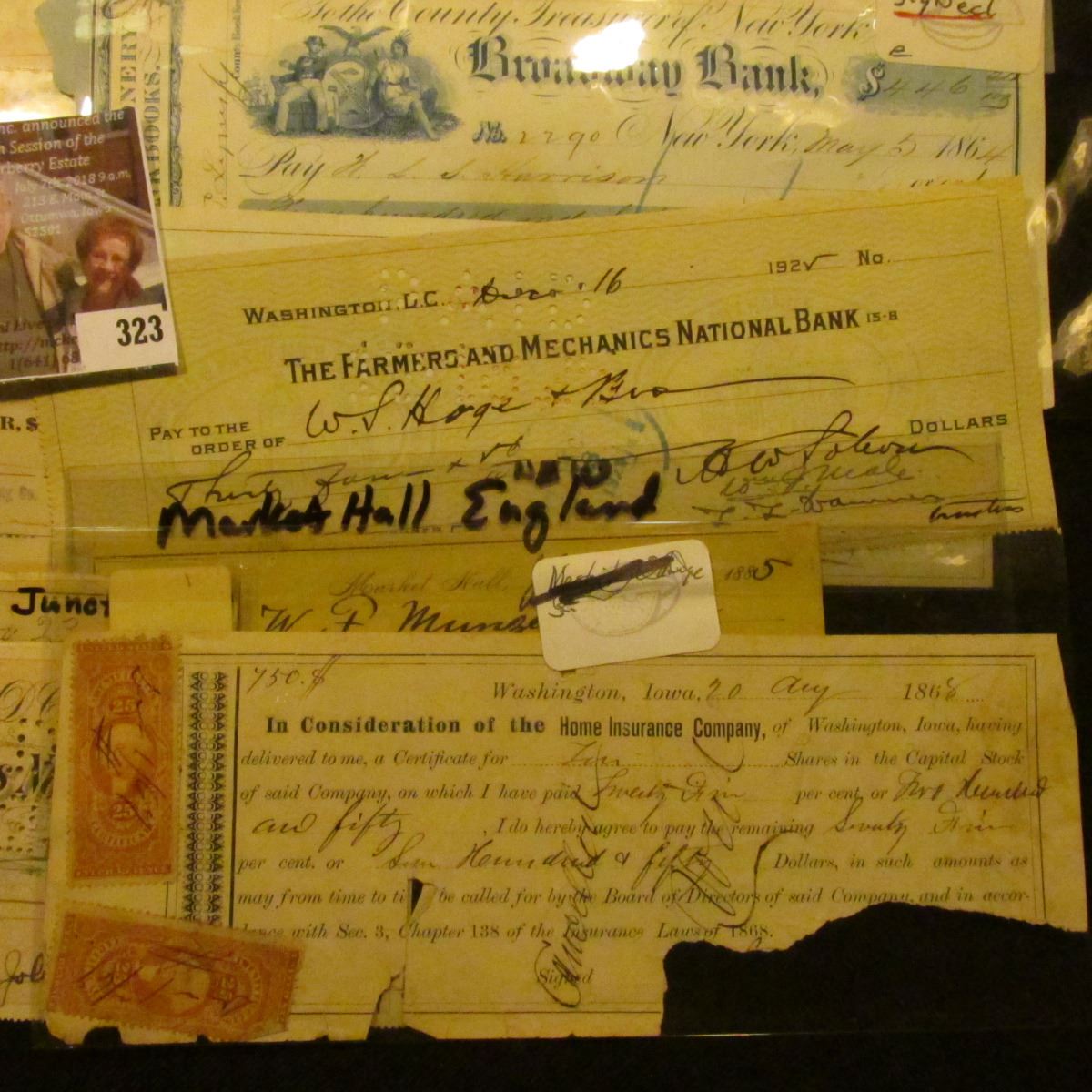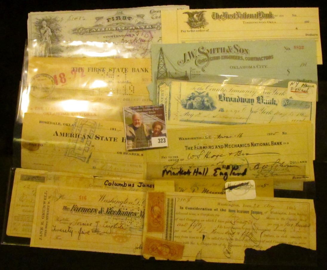 1885 Market Hall, England Check; 1868 Washington, Iowa Check with Revenue Stamps; 1899 "Farmers & Merchants State Bank, of Columbus Junction, Iowa"; 1906 "City National Bank Tipton, Iowa"; 1922 "The Farmers & Mechanics National Bank Washington, D.C."; "The County Treasurer of New York Broadway Bank" signed by the Mayor in 1864; 1880 Check from Watertown, N.Y. drawn on the "Jefferson County National Bank" 1925 Washington, D.C. "The Farmers and Mechanics National Bank"; 1910 era "J.W. Smith & Son Consulting Engineers, Contractors Oklahoma City, Ok."; 1920 era check "The First National Bank Tishomingo, Okla."; 1919 Rosedale, Okla. "American State Bank"; 1919 Check "The First State Bank Clarita, Ok."; & 1899 Check with Revenue Stamp "The First National Bank Coopertown, N.Y.".