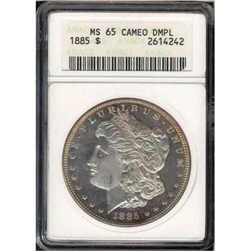 <b>1885 Morgan Dollar. ANACS graded MS65 Cameo Deep Mirror Prooflike.</b> A lustrous Gem that has icy gray-white color that shoots out beams of mirror sparkle and a good strike. The devices are cameo frosted, gently so but still very noticeable (and beautiful) against the reflective field. Could easily be mistaken for a Proof. There is a short scuff in the frost on the lower cheek, that is all <b>(PCGS # 97159)</b>