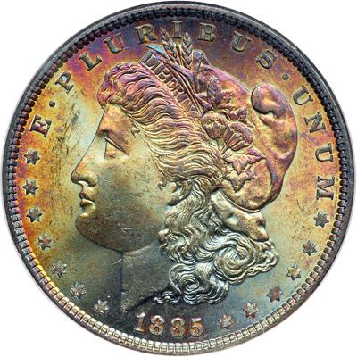 1885 Morgan Dollar. NGC graded MS-65. Old holder. The obverse has full light rainbow toning while the reverse shows toning near the edges/ (PCGS # 7159) .