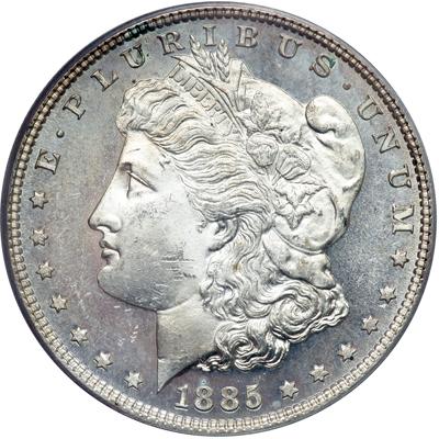 1885 Morgan Dollar. PCGS graded MS-64 Deep Mirror Prooflike. A nice untoned coin with a tiny mark at the forehead and a few luster grazes on the cheek. Would be gem otherwise (PCGS # 97159).