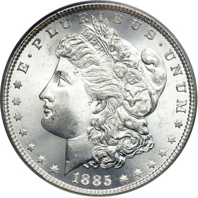 1885 Morgan Dollar. PCGS graded MS-66. A Gem quality white coin (PCGS # 7158).