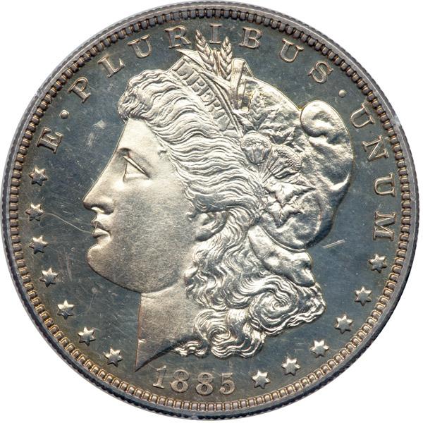 1885 Morgan Dollar. PCGS graded Proof 64. Housed in a First Generation Holder. Light hint of gold toning. Only 930 minted. Pop 59; 30 finer (PCGS # 7320) .